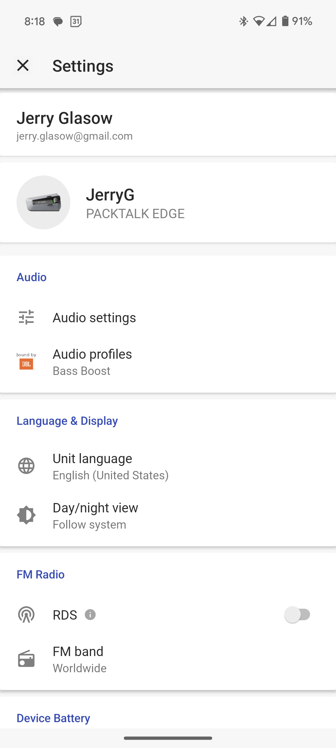 If you don’t have the Cardo Connect App on your phone, go to the Google Play Store; find it by searching on “Cardo Connect”; and install it. Once installed, open it and it should automatically connect to your Cardo unit as long as it is turned on. It’s been awhile since I went through that process for the first time, so there may be some steps to doing that. If it doesn’t connect, completely close the app and reopen it.