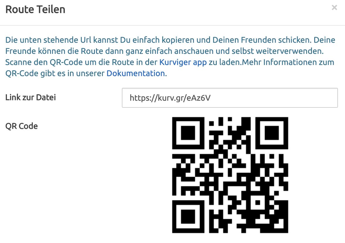 The share action produces a Kurviger (short) url and QR code which contain all routing data.