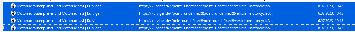 Wenn es am Rechner war kannst du auch den Browser Verlauf öffnen und die kurviger routen sind alle im Verlauf.
