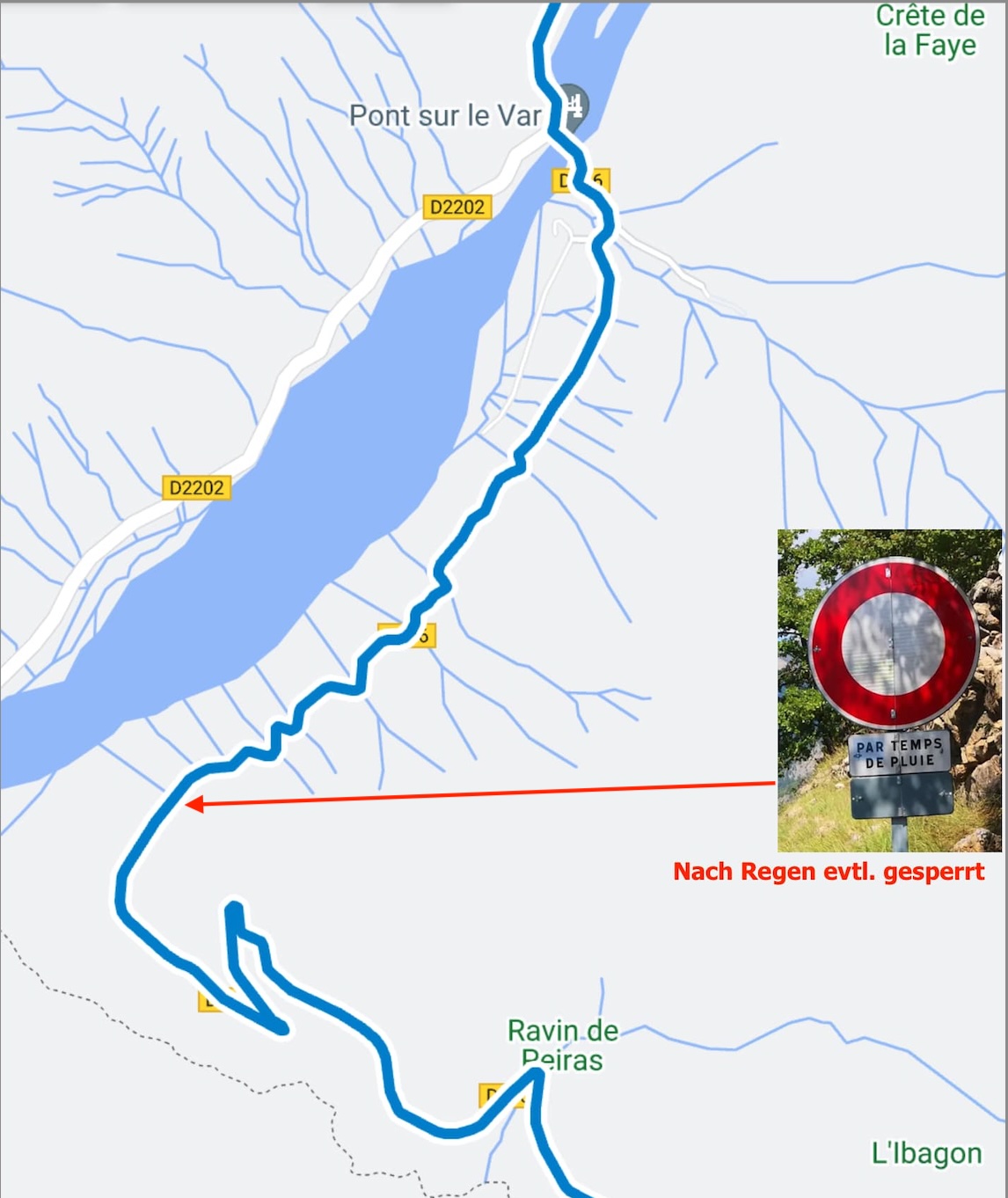 Jetzt bin ich mir fast sicher, dass da ein Bug in Kurviger ist: Ich probiere, einen Wegpunkt auf die Straße, weit weg von der Furt zu setzen: