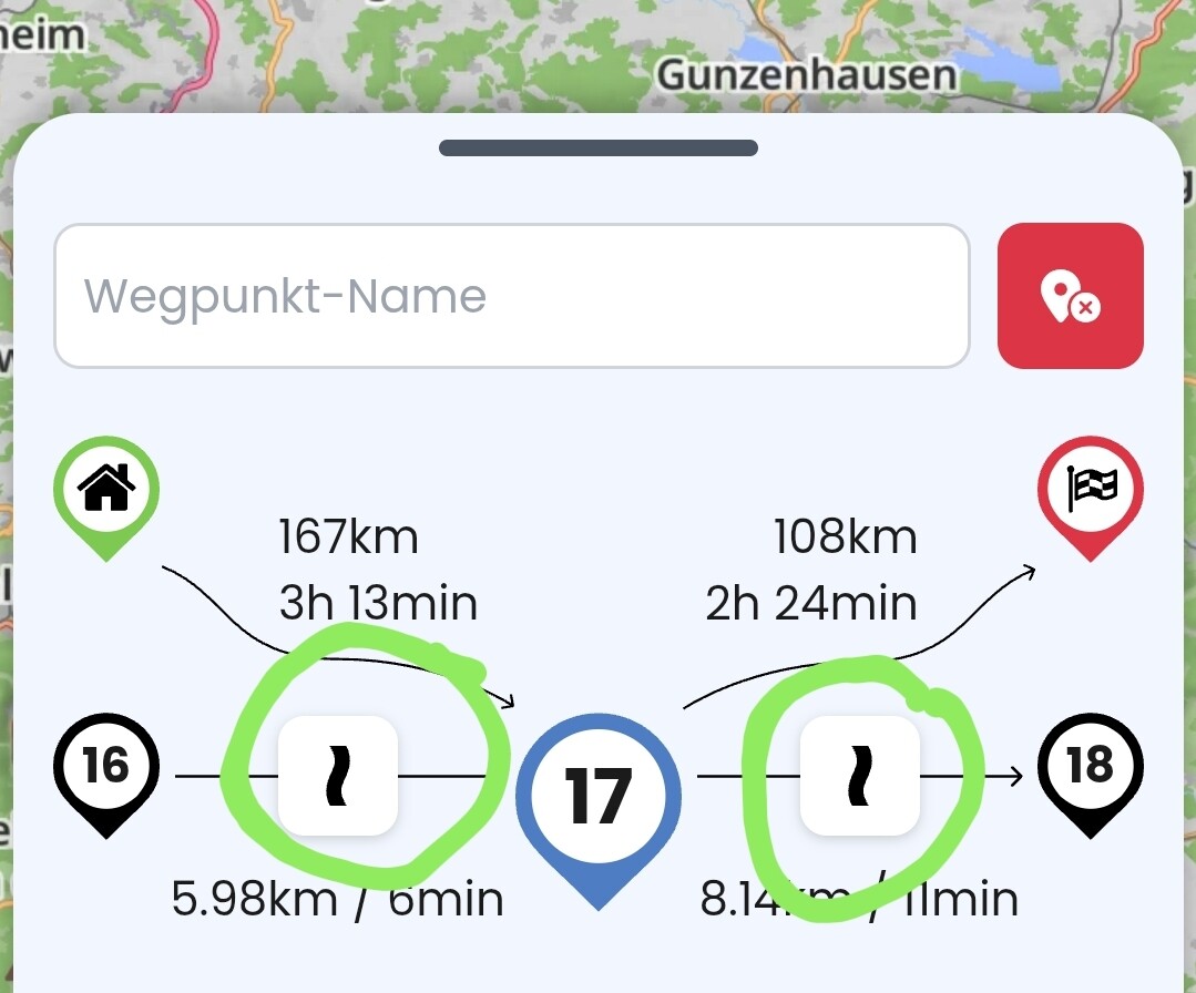 wenn Du das antippst, bekommst Du die Auswahl der Routenoptionen für die jeweilige Sektion gezeigt und kannst die ändern - hilft das eventuell bei der Planung am Handy?