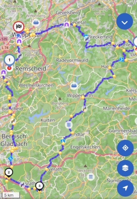 Bei deinem gesetzten WP 2 in Verbindung mit Zwischenziel 1 kann Kurviger ja nur noch durch Bergisch Gladbach führen …