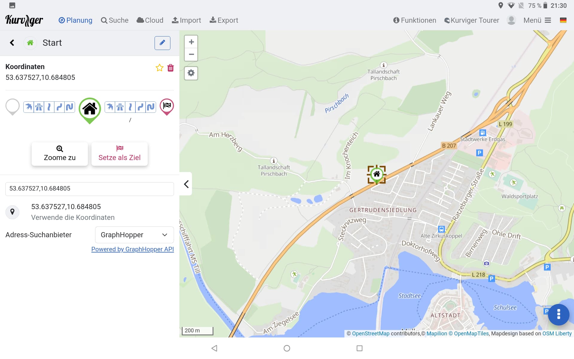 Das Fadenkreuz zeigt, welcher Wegpunkt ausgewählt ist - dessen Details werden im linken Panel angezeigt.