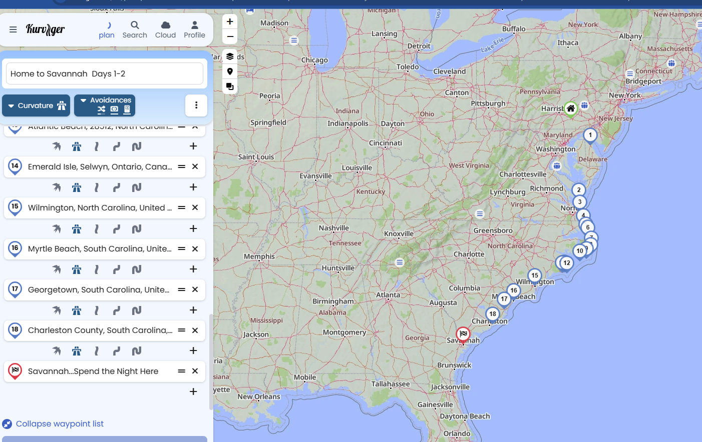 New user… creating several routes to go across the US. I will break this in to 2-3 day routes, although, I wish I could make them longer? With this current map, I do have 2-3 way points, along with shaping cues. Not sure why, but it’s slow. It’s been calculating the route for minutes now?? I think this is the link. Picture of route along the US eastern seaboard is included.