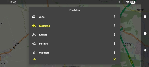 Also wäre es doch wirklich naheliegend, wenn man in den Profildaten auch PKWs und nicht nur Motorräder hinterlegen könnte. Oder nicht? Und das wäre bei Weitem nicht nur eine kosmetisch Anpassung. Abhägig von dem eingestellten Fahrzeugtyp könnte (müsste) man denn auch die Routengenerierung anpassen.