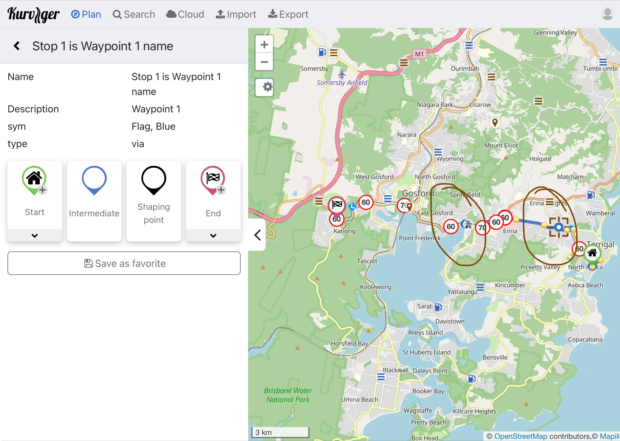 <wpt lat=“-33.438413” lon=“151.419754”><name>Stop 1 is Waypoint 1 name</name><desc>Waypoint 1</desc><sym>Flag, Blue</sym><type>via</type></wpt>