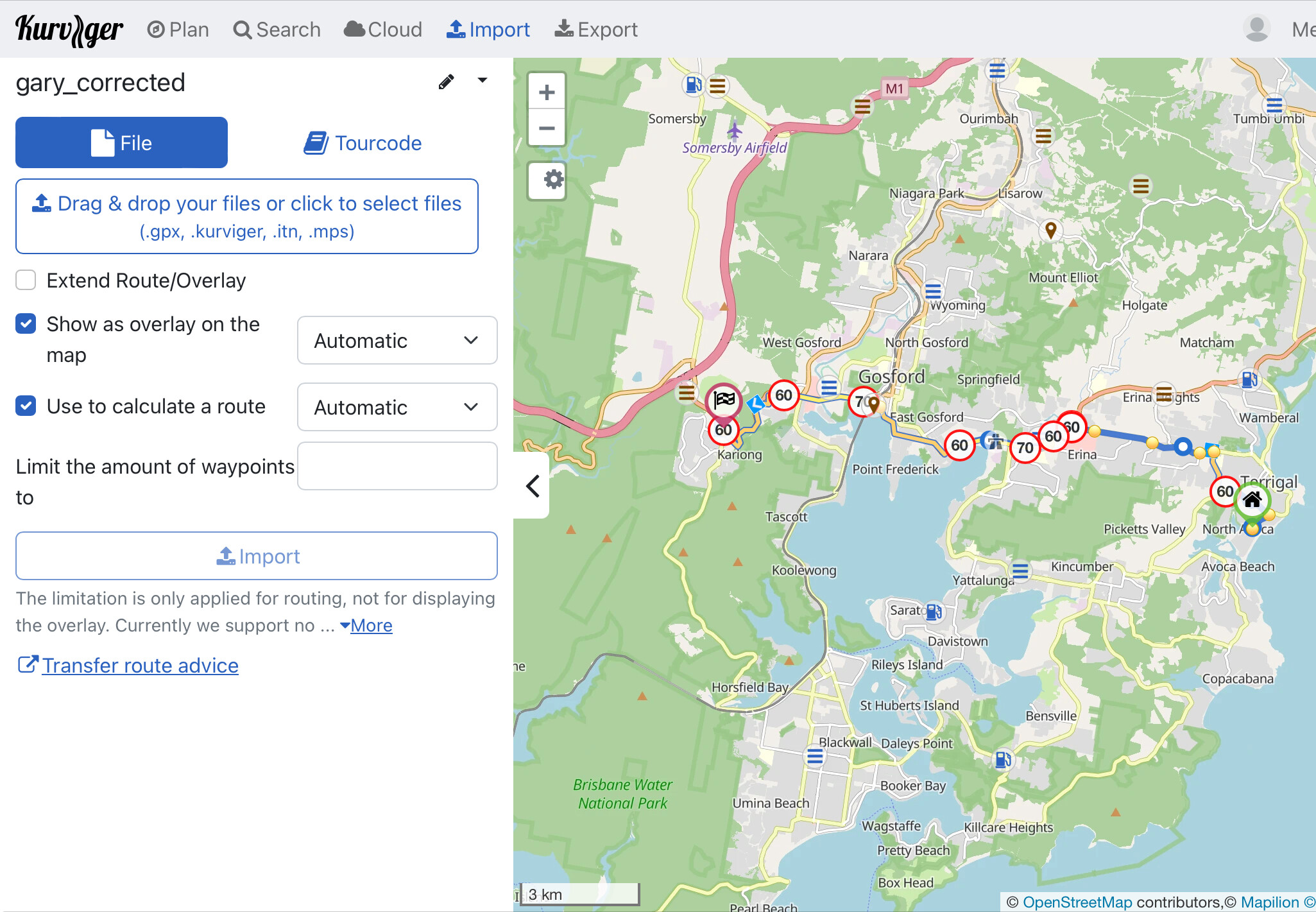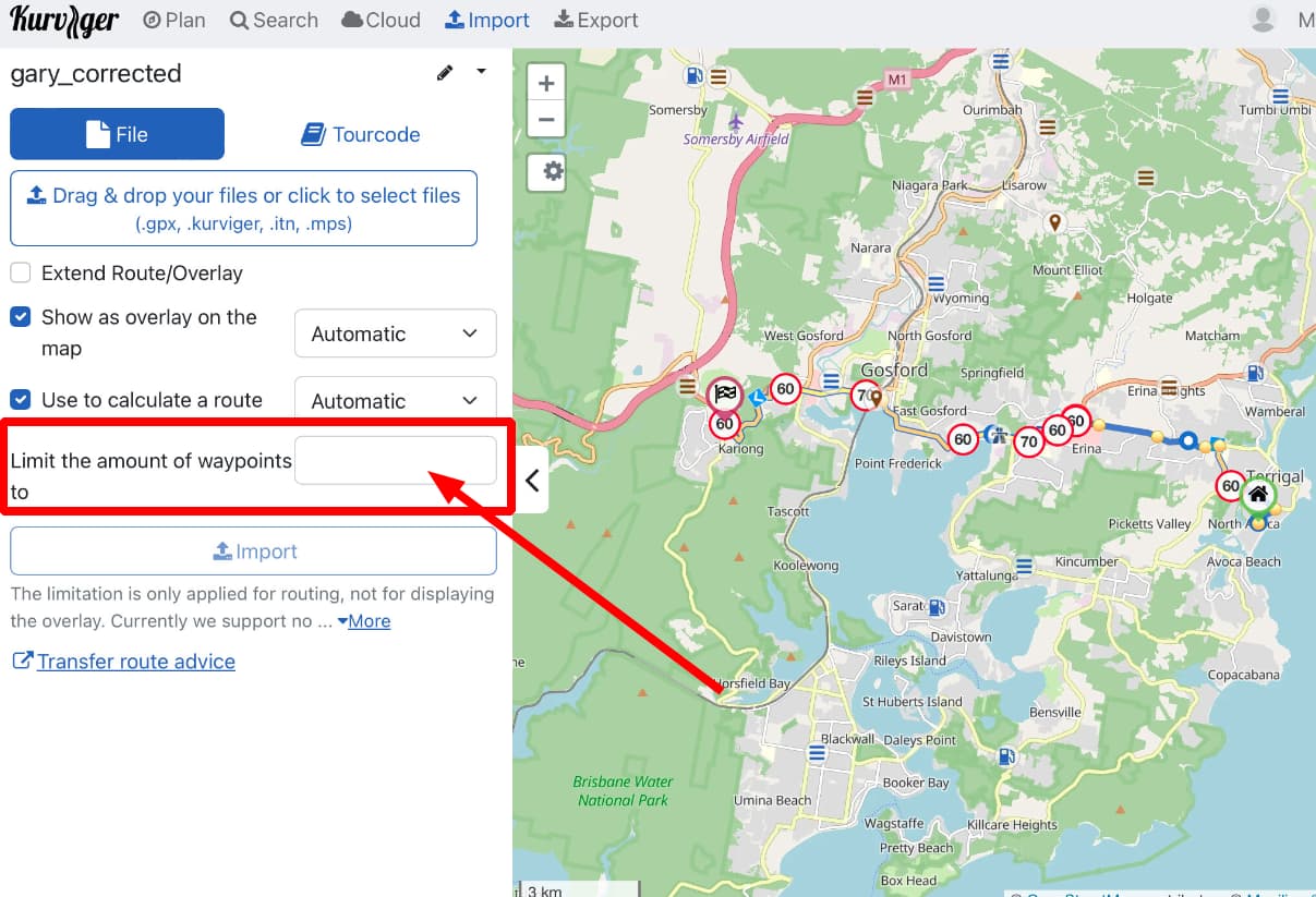 I cannot import any of my GPX files in to Kurviger. It will only provide Start and End points and gives me blue circles for all the Waypoints and Shaping Points.