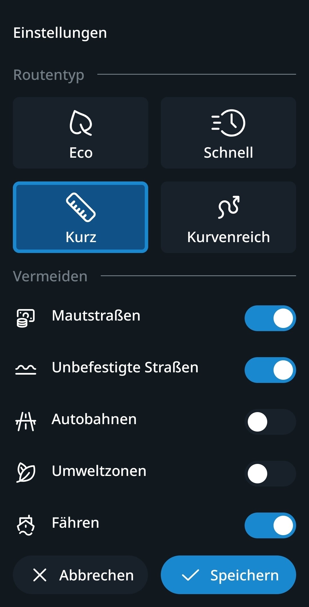 Ich nutze gelegentlich die TomTom-App und finde es ziemlich praktisch vor dem Navigieren zwischen “Eco/Schnell/Kurz/Kurvenreich” zu wählen. Es geht schneller als immer die Kurvigkeit und die Vermeidungen einstellen zu müssen. Wäre es möglich diese Routingtypen zu integrieren?