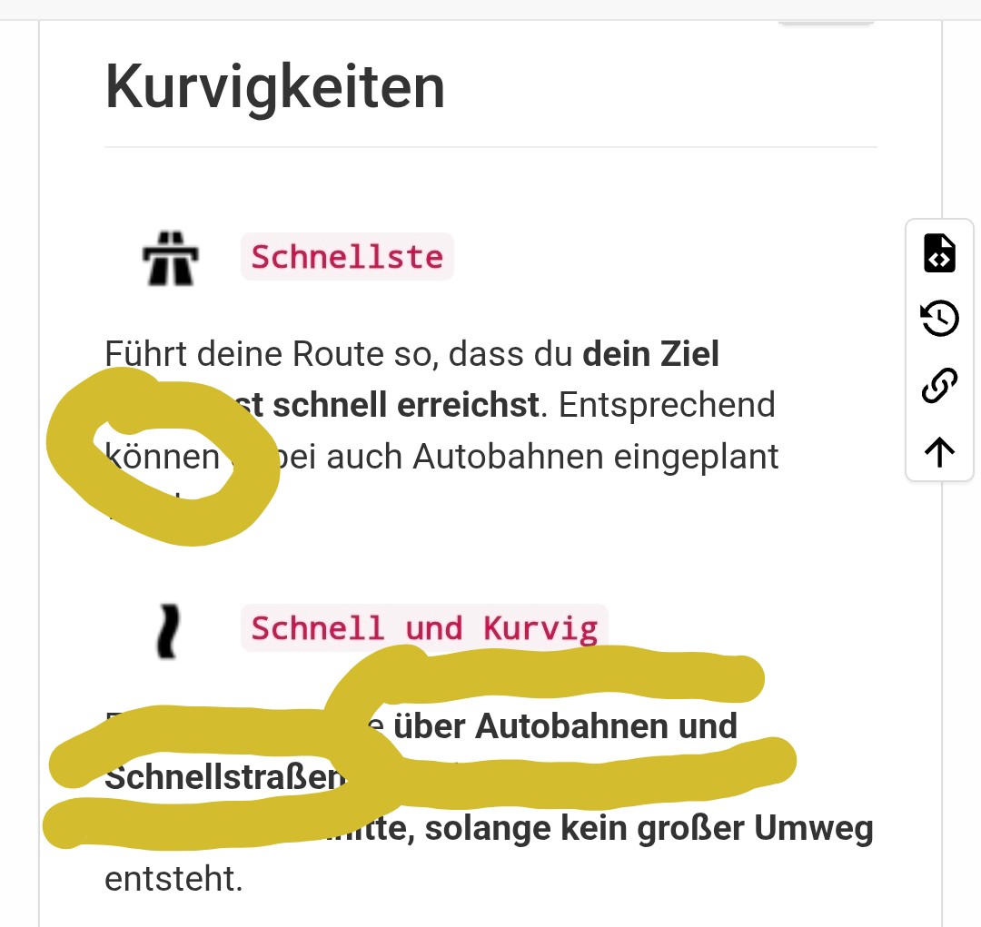Wenn bei “Schnellste Route” die Beschreibung “…können dabei auch Autobahnen eingeplant “ steht ist es ein Widerspruch mit “Schnell und Kurvig”. Hier werden Routen über Autobahnen und Schnellstraßen” geplant. Eigentlich müssten hier weniger Autobahn berücksichtigt werden.