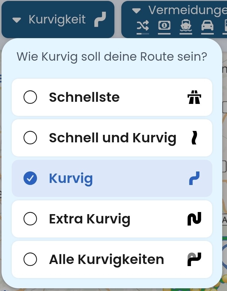Kurviger berechnet auch ohne Vermeidungen schon eine schöne motorradtaugliche Strecke (= wird dich in “Kurvig” nicht über Autobahnen schicken und auch z.B. Hauptstraßen eher meiden soweit das sinnvoll ist). Betrachte die Vermeidungen daher eher als Zusatz: wenn zum Beispiel unbefestigte Straßen oder BAB und Schnellstraßen, auch nur für ein kleines Stück, für dich nicht in Frage kommen, kannst du das hier nochmal strenger ausschließen.