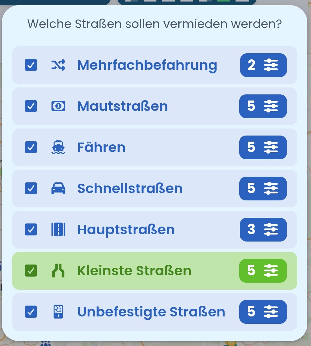 Wenn du allerdings alle Straßenarten auf eine hohe Vermeidung stellst, bekommt der Routing-Algorithmus Rrobleme überhaupt eine Strecke für dich zu finden.