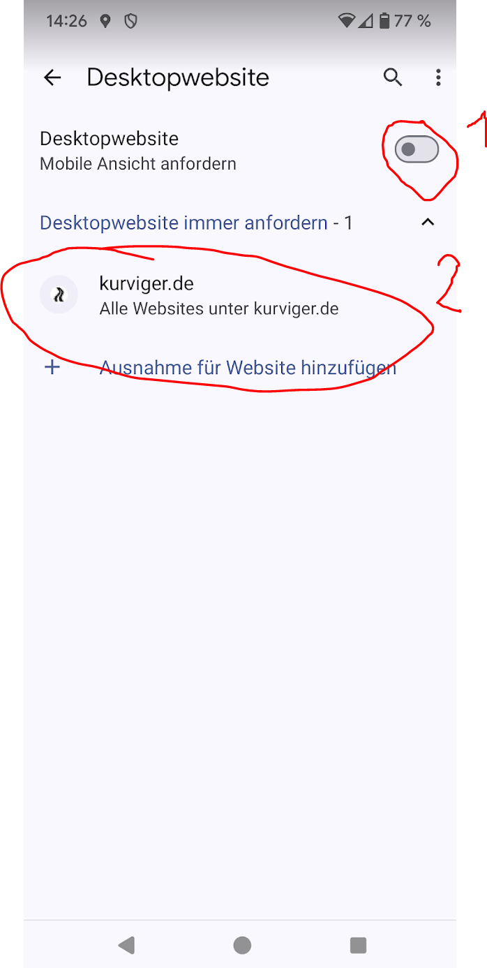 Hier kann man nun auswählen ob alle Seiten, die man auf dem Handy in Chrome aufruft als Desktopwebseite dargestellt werden sollen (1) oder man fügt Ausnahmen für bestimmte Seiten (2) hinzu