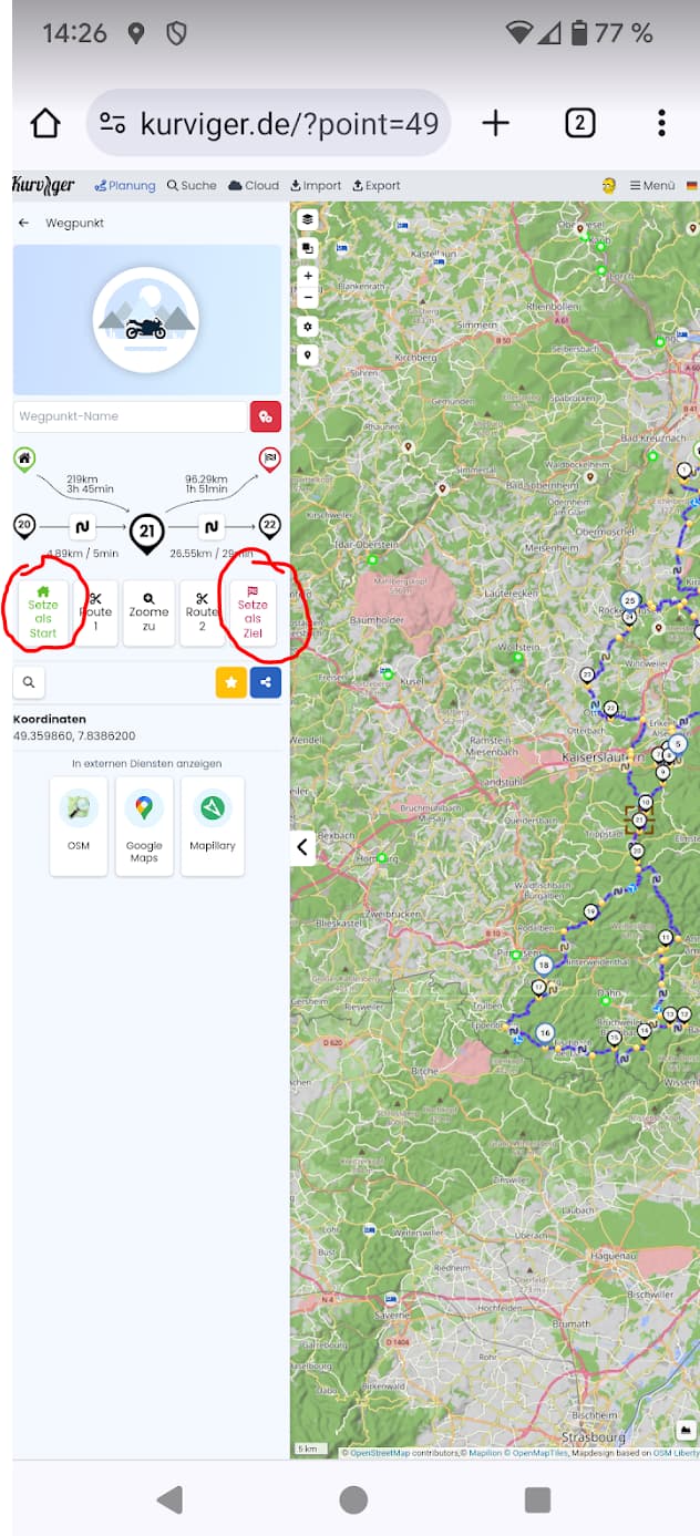 Ist aber schon kurios. Wenn ich die Kurviger App öffne, kann ich den WP nicht zum Startpunkt machen, auch nicht, wenn ich über Google Chrome kurviger.de auf dem Handy aufrufe - da werde ich direkt zur App geleitet. Am PC auf der Webseite geht’s