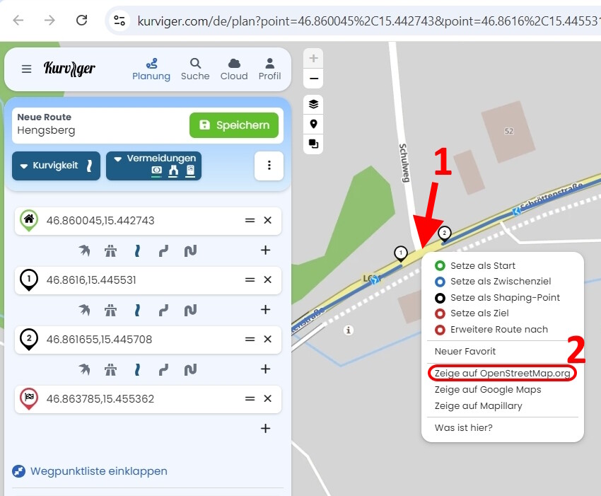 rechtsklick auf die Problemstelle in der Kurviger-Website