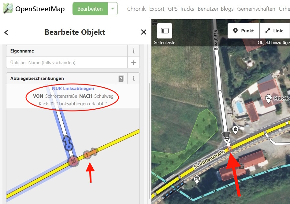 Sieht so aus. Ich habe sie jetzt wieder hinzugefügt - das Linksabbiegen von der Schröttenstr. auf den Schulweg ist dort verboten. Ich finde, man sollte fehlerhafte Daten korrigieren anstatt sie zu löschen.