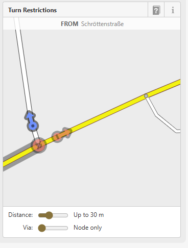 Dann ist etwas Intuition gefragt. Du suchst ja nach der Ursache und schaust dir erst die Straßenabschnitte an und letztendlich auch den Abbiegepunkt. Klick auf diesen Punkt zeigt dann die Abbiegebeschränkungen (sofern es welche gibt) auf der linken Seite.