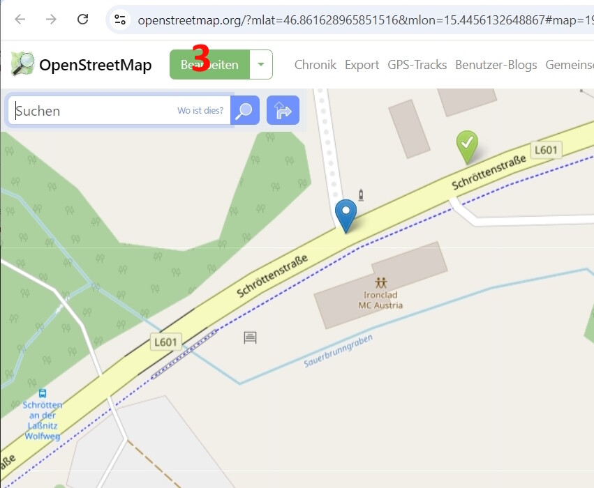 Auf “Bearbeiten” klicken (dazu musst du dich in OSM mit einer Userid registrieren - ist kostenlos)