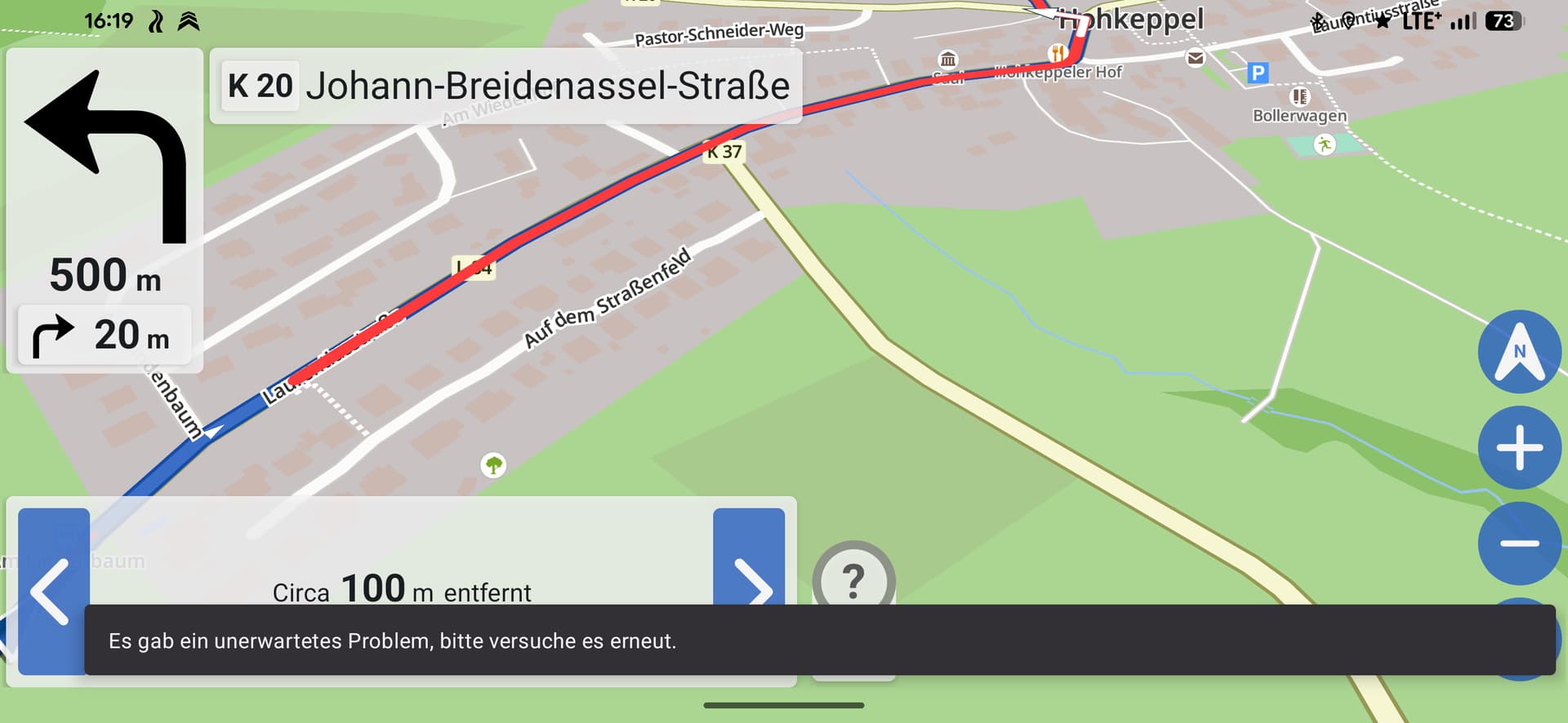 pixel 7 pro, nichts besonderes davor gemacht. einfach gefahren, kam zu einer Strassenspere, angehalten, direkt versucht die Sperre in der App einzugeben. Mehrmals bekam den Fehler wie im Screenshot. Hab dann Navigation gestoppt und wieder gestartet, der Fehler war immer noch vorhanden. Dann noch mal gestoppt, App force stoped (beenden erzwingen?), zurück zur App, “Fahrt fortsetzen”, “Sperre hinzufügen”, der Fehler war immer noch da, dann hab ich einfach manuell die Route angepasst.