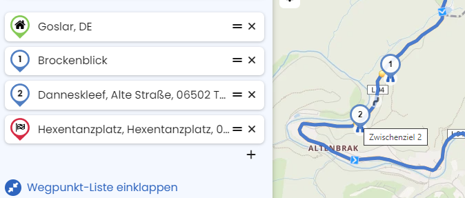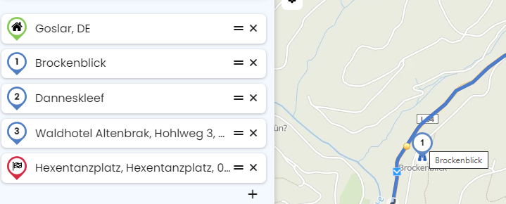 Wenn ich jedoch einen POI auf der Karte als Zwischenziel einfüge, wird er sowohl in der Liste als auch beim Mausover auf der Karte angezeigt, z.B. hier Punkt 1, der Brockenblick: