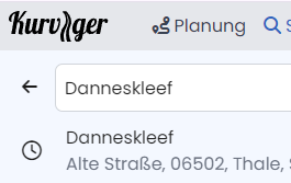 Es geht um die Suche von Orten. Wenn ich bei der Suche einen Begriff eingebe, zum Beispiel “Danneskleef”, dann zeigt mir Kurviger einen gefundenen Eintrag