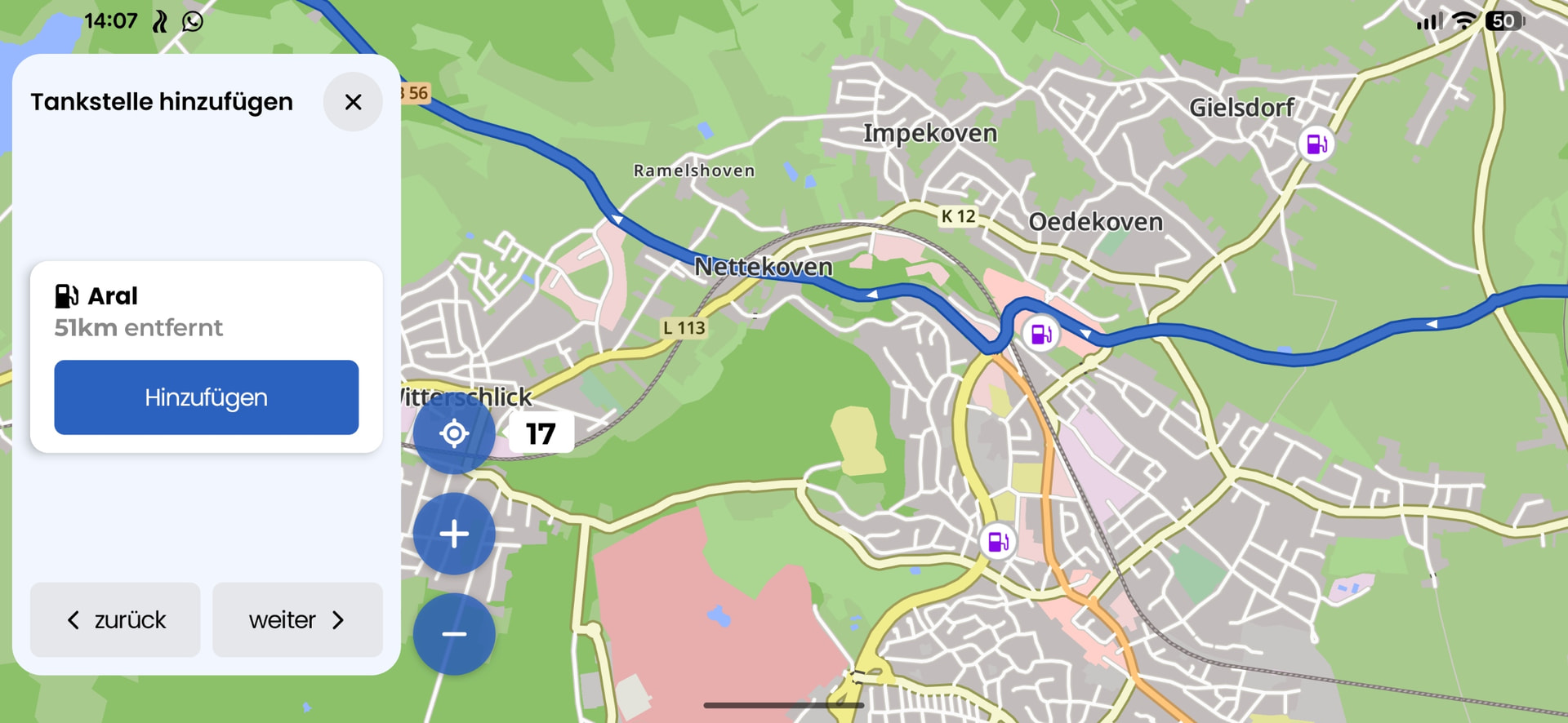 Die Funktion ist aber so gedacht, dass man möglichst unkompliziert unterwegs eine Tankstelle hinzufügen kann. Das erfordert z.B. eine Vereinfachung durch eine gewisse Auswahl von Tankstellen, ähnlich zu GMaps. So z.B. die Tankstelle in Rheinbach, die am nähsten zu Route liegt, statt alle.
