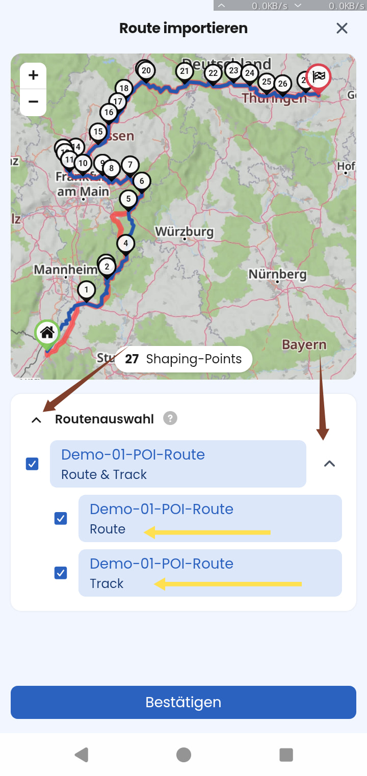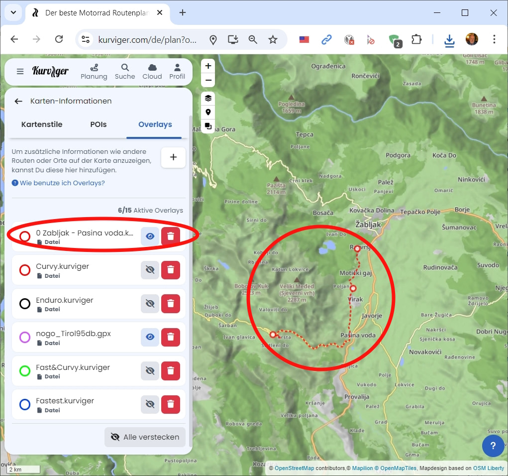 Option 1: If you want to import a “track” and especially one that entails offroad sections that might not be in our map data, you’re better off using map overlays. This way, you can see your track on the map exactly as it is and change its color to your liking.
