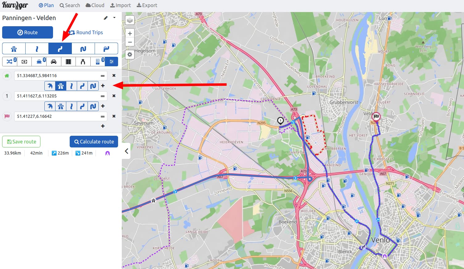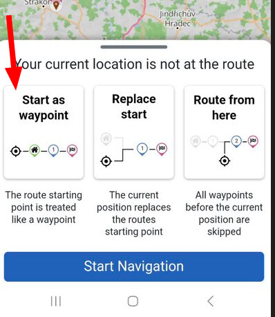 I sometimes have routes made through Kurviger with a starting location that is quite a distance from the current location. When you start, you can indicate that you want to navigate to the starting point. However, the same settings are then used to create a beautiful route to the startingpoint, while you actually want to get to the route as quickly as possible (same idea when navigation through cities). Can I indicate somewhere that the first part should be the fast route, without having to add the current waypoint as part of the route?