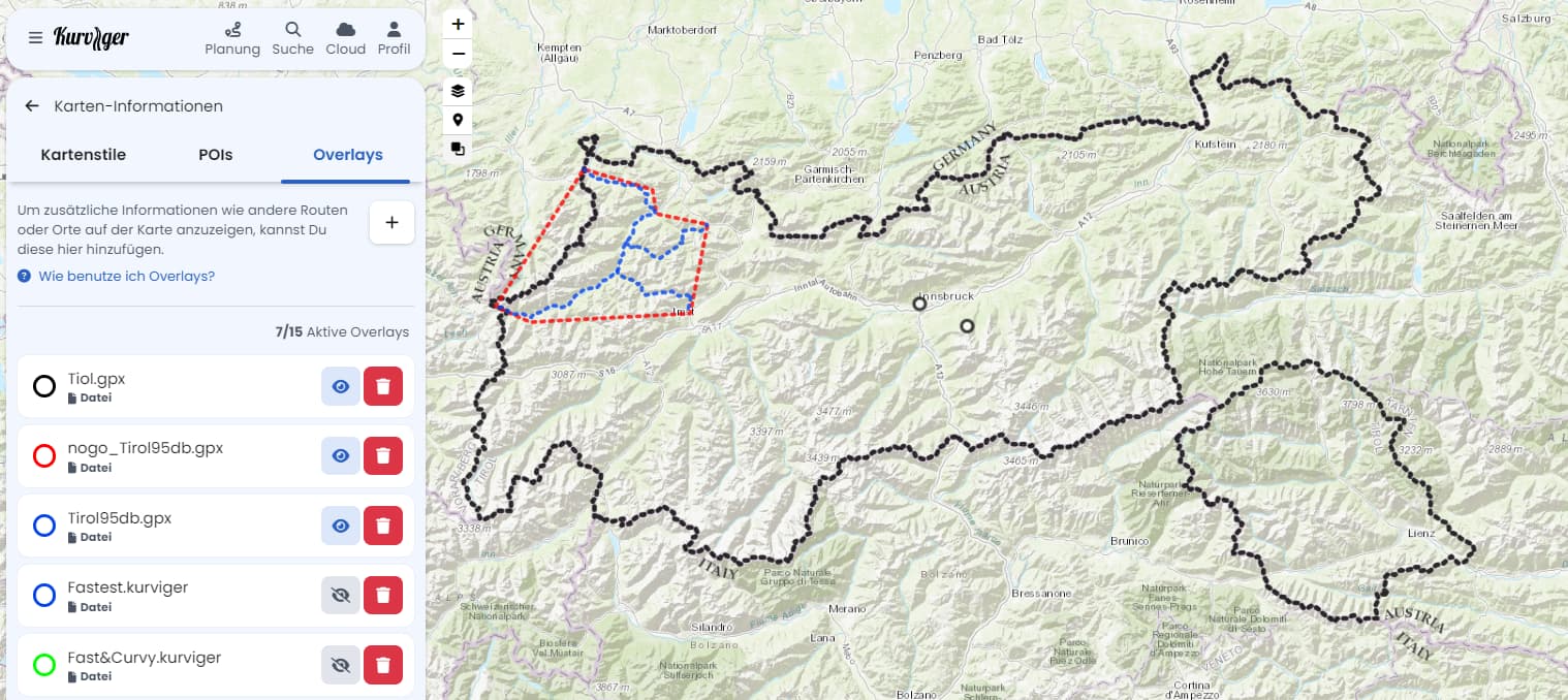 Nicht direkt. Aber vielleicht kannst du dir eine GPX mit den betroffenen Abschnitten bauen und als Overlay auf deine Kurviger Karte legen. Dann siehst du zumindest deutlich einfacher, ob du deine Strecke noch anpassen musst. So bist du auch bei zukünftigen Planungen gewappnet. Hier listet der ADAC z.B. die entsprechenden Strecken Tirol – Fahrverbot für Motorräder auch in der Saison 2025 (Stand April 2025).