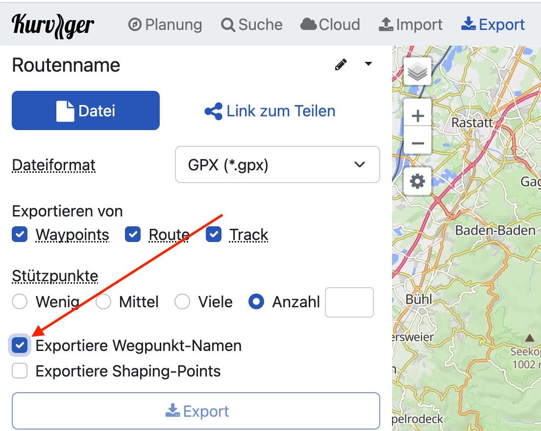 In this case, it’s not kurviger.de fault, as all the names are accurately reproduced in the .gpx file. Check the import options in your Garmin device and don’t just take the track from the .gpx file, as it contains no names.