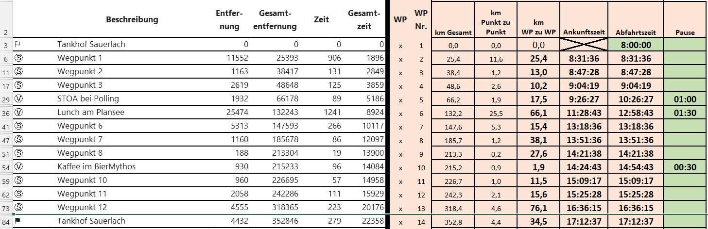 Ich habe mir Deine schicke Tabelle auch mal angeschaut. Verstehe ich die Tabelle richtig, dass bei WP1 eine Pause von 1 Std eingelegt wird oder habe ich einen Gedankenfehler, weil Ankunftszeit und Abfahrtszeit nicht analog sind?