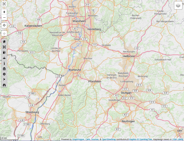 Scale 20 km: residential areas of the area Stuttgart - Heilbronn are no more seperate areas, there only is one big residential area. That’s confusing. As recognizable, this behaviour is not only at Stuttgart - Heilbronn, it’s at other areas too (in the picture e.g. Karlsruhe - Mannheim - and more). This behaviour should be avoided.