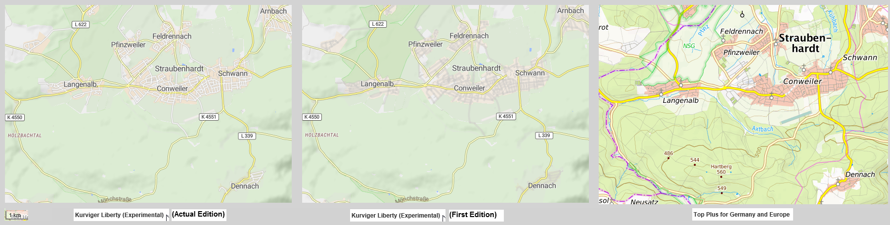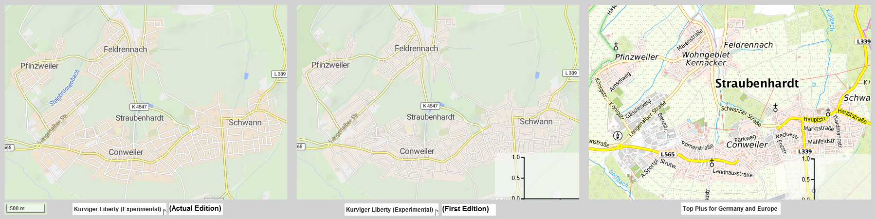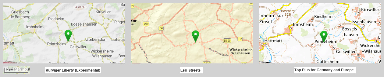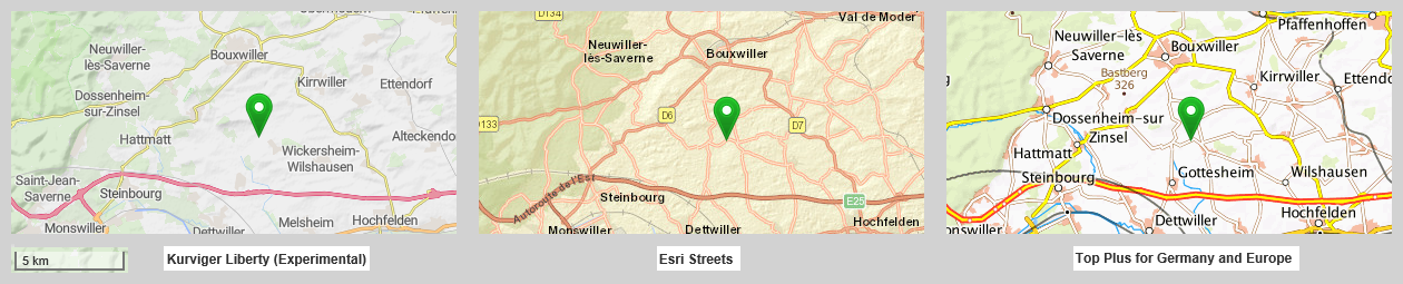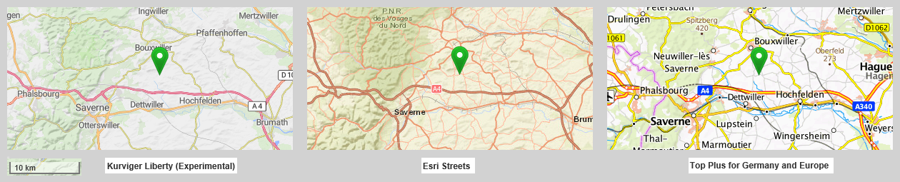 For shortlink 4 (Alsace D59) following a comparison of the map styles from actual Kurviger Liberty, Esri Street and Top Plus for Germany and Europe at different scales (clicking on the pictures show them increased).