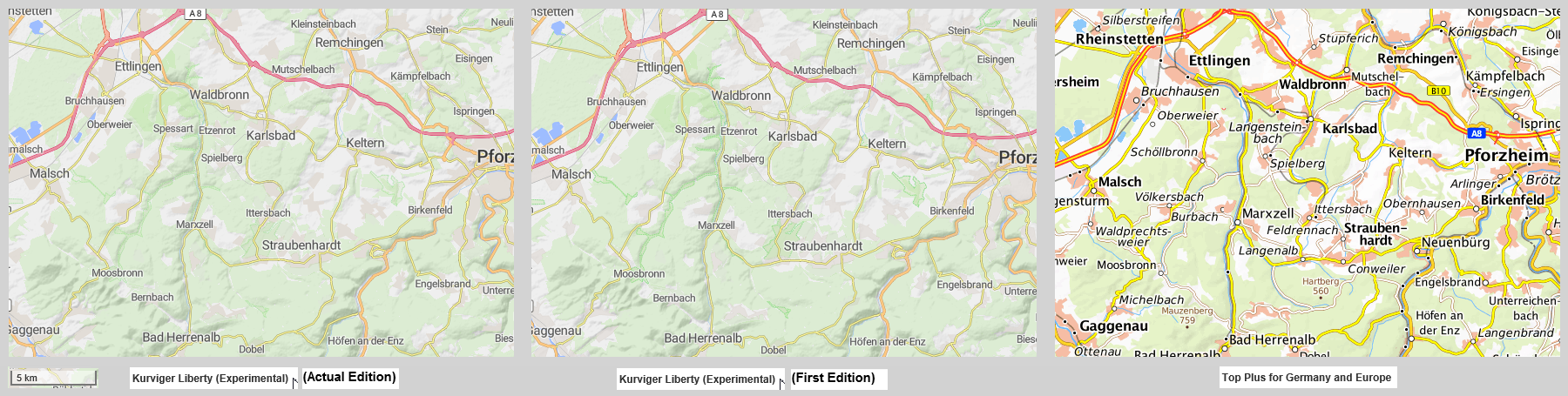 Scale 5 km: The road at the waypoint and some others are easy to recognize at the map styles in the middle and on the right side, but not at Kurviger Liberty on the left side of the examples.