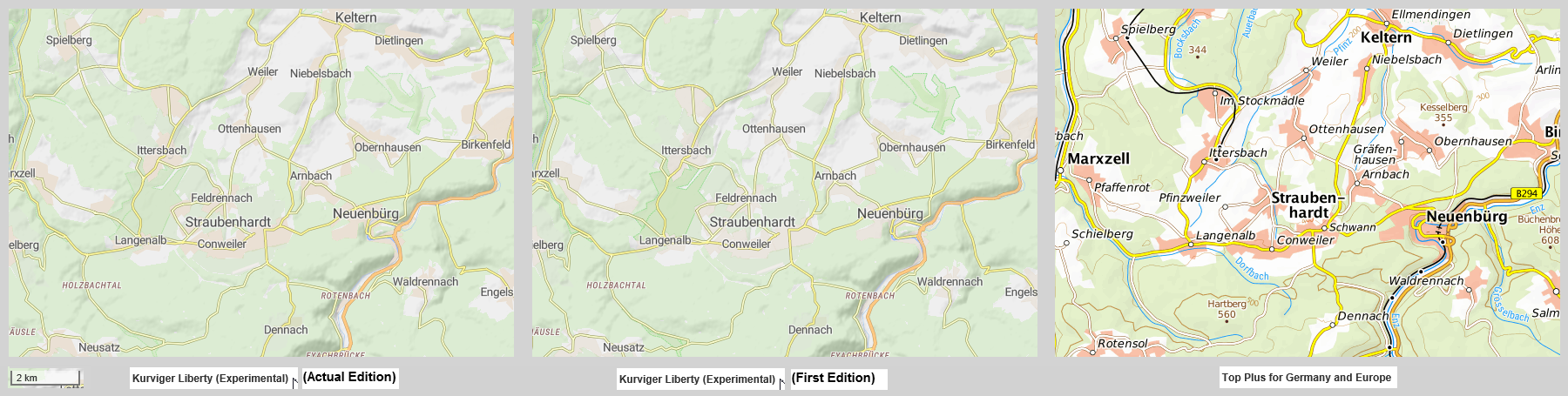 Above just my opinion not knowing if there are relations betweeen the styles at different scales. It is an advantage to the other map styles to increase the usability of Kurviger Liberty for planing routes with setting of waypoints (not only using the Kurviger algorythms).