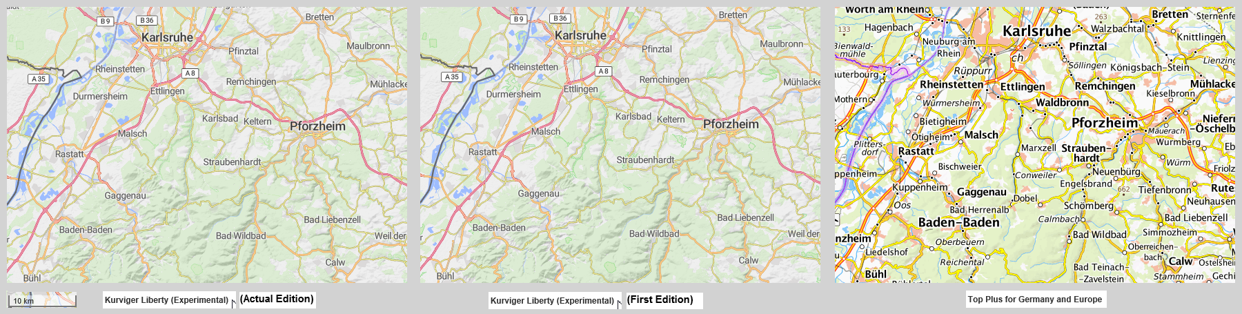 Scale 10 km: At this scale the areas with buildings are recognizable bad with a weak gray only at bigger villages and towns. Perhaps here can be displayed more using a colour as mentioned at scale 5 km. At Top Plus for Germany … there are more such areas recognizable (but this strong colour don’t fit to the style of Kurviger Liberty).