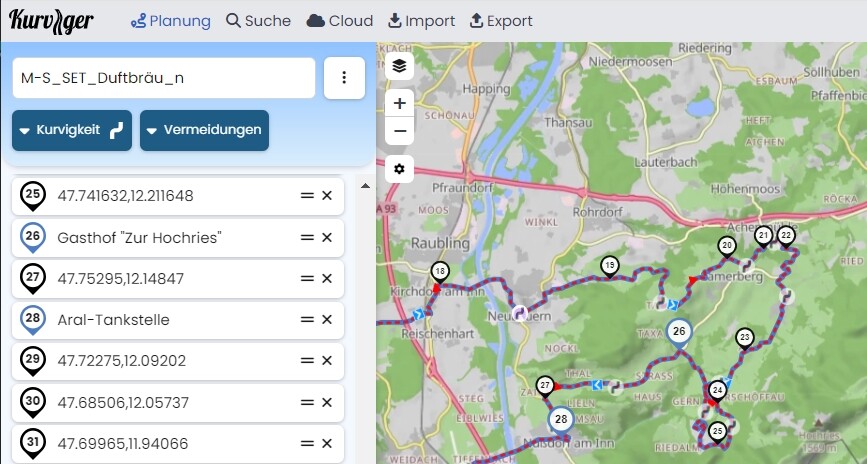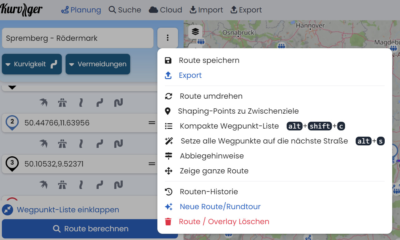 Weder auf der Karte, noch in der Wegpunktliste ist die Unterscheidung von Via- und Shaping-Points gut zu erkennen: