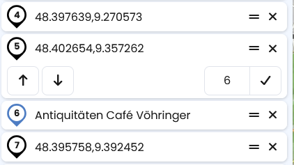 Der entsprechende Wegpunkt (hier 5) wird vor den Wegpunkt im Zahlenfeld (hier 6) geschoben. Tippst du als 11 dort ein, wird nach dem “okay” der Wegpunkt 5 zum Wegpunkt 10.