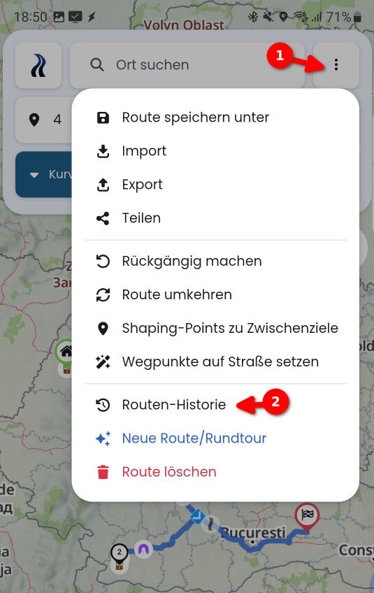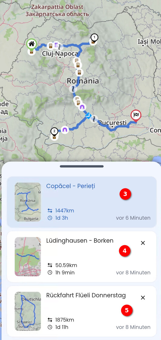 Die (3) habe ich mal schnell durch Rumänien geplant, die (4) und (5) zuvor geladen. An dieser Stelle erhält man auch ein kleine Übersichtskarte zur Route