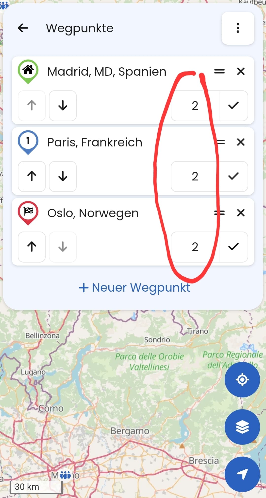 In der App kann man theoretisch mehrere Wegpunkte in Liste einfügen.