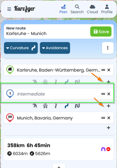 Ich denke, die Bedienung ist nachvollziehbar. Auf der Webseite gibt es die Möglichkeit an beliebiger Stelle einen Wegpunkt mit dem Plus-Zeichen einzufügen. Das versucht @Guenniguenzelsen eben auch in der App.